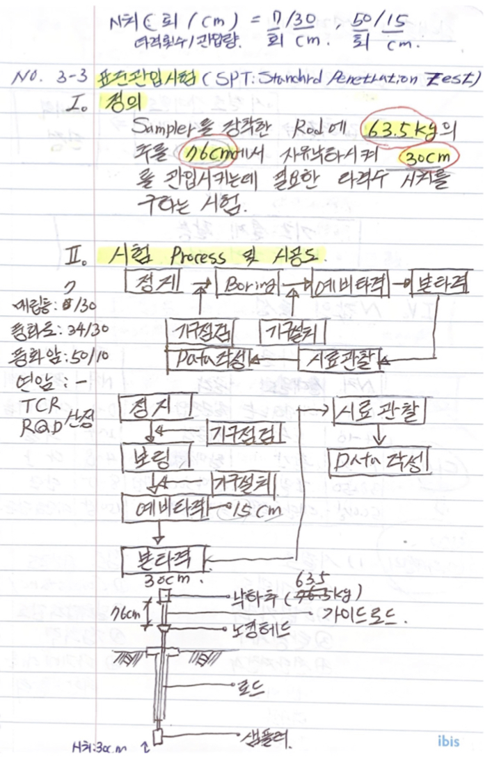 표준 관입 시험은 63.5kg의 추를 76cm에서 자유 낙하하여 30cm를 관입하는데 필요한 타격수 N 치를 구하는 것입니다.